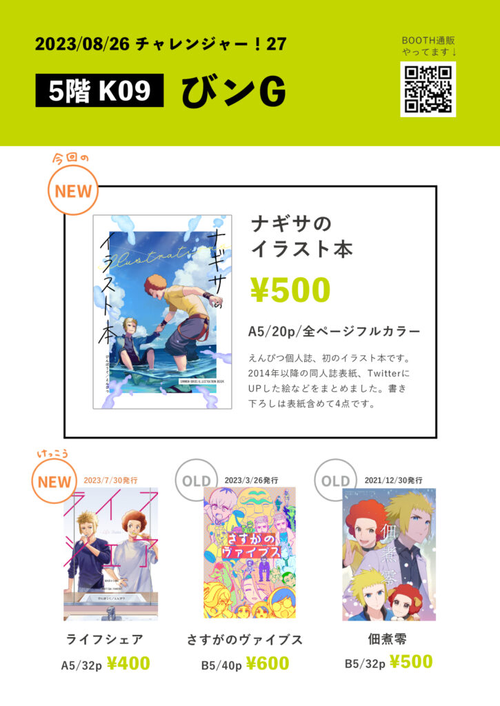 8/26イベントお品書きとか 2023年8月24日 投稿者: en-pit 8/26(土)のイベントがもう明後日に迫ってきました。お品書きなどをUPします! 新刊の自宅発送分が届いて、現物も確認しました。とっても良い感じに仕上がってて嬉しいです。同人誌はそこそこの回数出してると思うけど本が出来上がってくるのは毎回新鮮に嬉しくてすごい。 冊子のちょうど真ん中の見開きがこうなってて、自分で描いておきながら「エモッ!」て言いました。紙で見るとまた感慨深い。 準備が整い次第、この本も通販しますので、またお知らせします!イベントよろしくお願いします!! 前の記事メッセージ返信次の記事 チャレ!27ありがとう&メッセージ返信